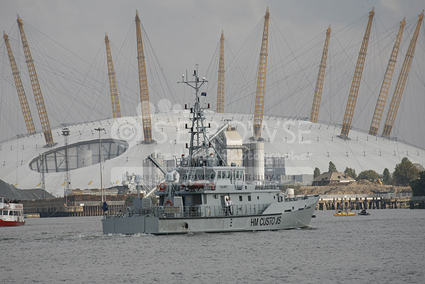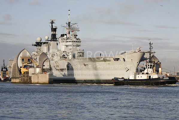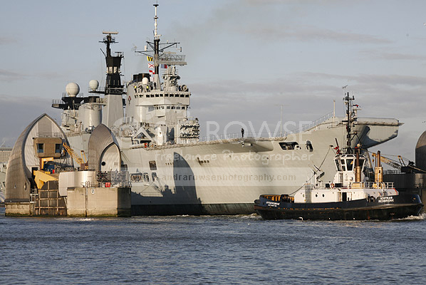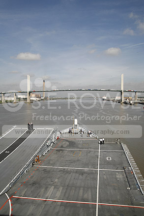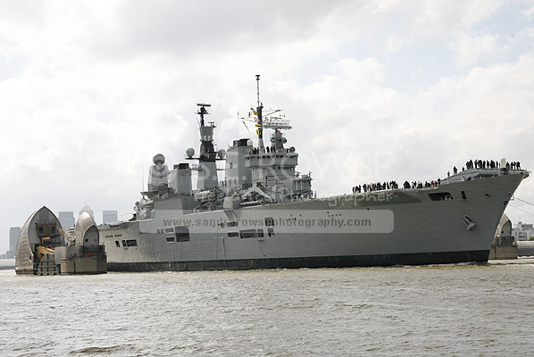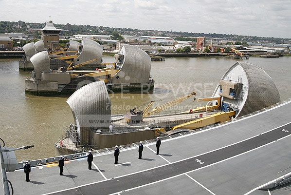HMS Ark Royal ahead the Thames Barrier